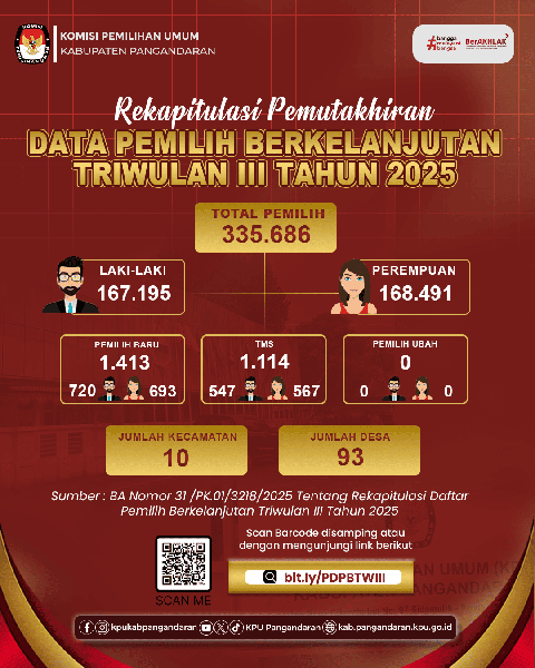 #TemanPemilih, KPU Kabupaten Pangandaran melaksanakan Rapat Pleno Rekapitulasi Pemutakhiran Data Pemilih Berkelanjutan (PDPB) Triwulan III Tahun 2024 pada Jum'at, 3 Oktober 2025 di Aula KPU Kabupaten Pangandaran. Hasil Rapat Pleno Rekapitulasi Daftar Pemilih Berkelanjutan pada Triwulan III Tahun 2025 yaitu sejumlah 335.686 dengan rincian Laki-Laki 167.195 dan Perempuan 168.491.