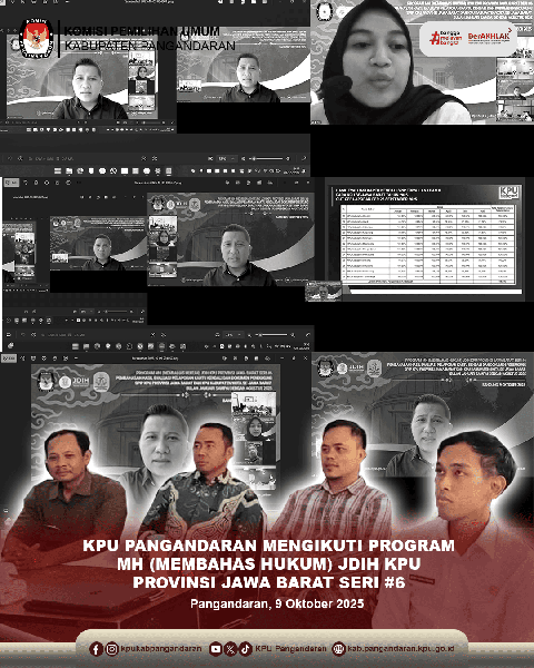 Pangandaran – KPU Kabupaten Pangandaran mengikuti kegiatan Program Membahas Hukum (MH) JDIH KPU Provinsi Jawa Barat Seri #6 yang dilaksanakan secara daring pada Kamis (9/10/2025).