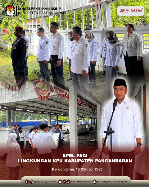 Pangandaran – KPU Kabupaten Pangandaran melaksanakan apel pagi di halaman Kantor KPU Kabupaten Pangandaran pada Senin (13/10/2025). Apel dipimpin langsung oleh Ketua KPU Kabupaten Pangandaran, Muhtadin.