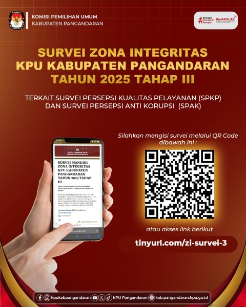 Survei ini merupakan bagian dari komitmen KPU Kabupaten Pangandaran dalam meningkatkan mutu pelayanan publik serta memperkuat integritas kelembagaan melalui Pembangunan Zona Integritas menuju Wilayah Bebas dari Korupsi (WBK) dan Wilayah Birokrasi Bersih dan Melayani (WBBM).