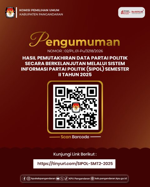 KPU Kabupaten Pangandaran telah melakukan pemutakhiran data partai politik secara berkelanjutan melalui SIPOL Semester II Tahun 2025 dan mengumumkan hasil pemutakhiran data partai politik pada Website Resmi KPU Kabupaten Pangandaran.