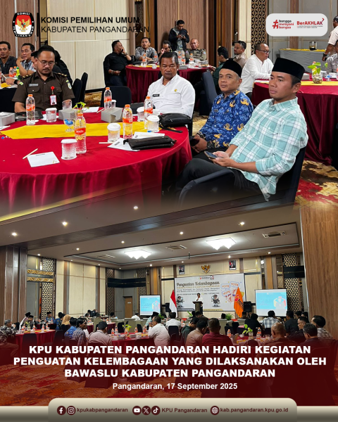 #TemanPemilih, Ketua KPU Kabupaten Pangandaran Bapak Muhtadin menghadiri undangan Bawaslu Kabupaten Pangandaran terkait(dalam kegiatan) Penguatan Kelembagaan Pengawas Pemilu di Kabupaten Pangandaran dengan tema “Sinergi Kelembagaan dan Partisipasi Publik: Menguatkan Peran Bawaslu untuk Pemilu Demokratis dan Berintegritas” yang di gelar di Hotel Horison, Pangandaran, Rabu (17/9/2025).