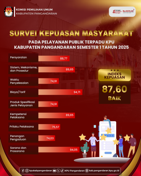 #TemanPemilih, KPU Kabupaten Pangandaran mengucapkan terima kasih kepada masyarakat atas kepercayaan dan partisipasi dalam penilaian Indeks Kepuasan Masyarakat (IKM) Pelayanan Publik KPU Kabupaten Pangandaran periode semester 1 tahun 2025, sehingga memperoleh nilai 87,6.