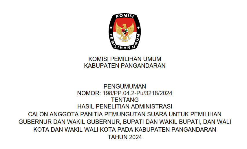 Sehubungan dengan Komisi Pemilihan Umum Kabupaten Pangandaran telah melaksanakan tahapan Penelitian Administrasi Calon Anggota Panitia Pemungutan Suara pada untuk Pemilihan Gubernur dan Wakil Gubernur, Bupati dan Wakil Bupati, dan Wali Kota dan Wakil Wali Kota Tahun 2024, disampaikan beberapa hal sebagai, berikut: