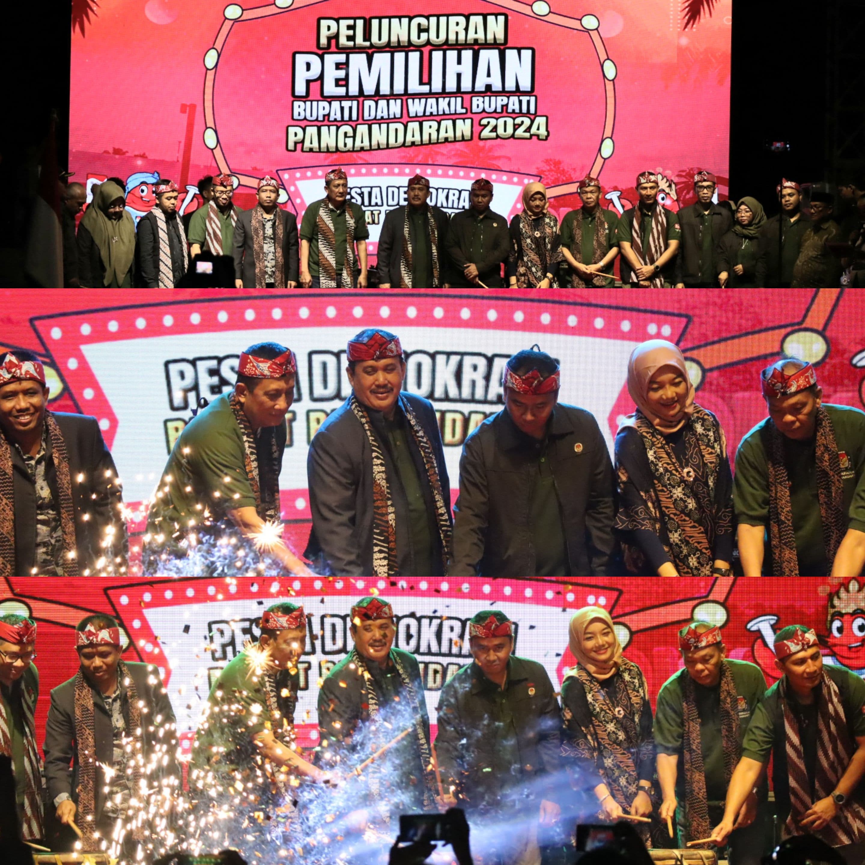 Pangandaran - Komisi Pemilihan Umum (KPU) Kabupaten Pangandaran resmi memperkenalkan maskot dan jingle Pilkada 2024 kepada masyarakat dalam rangkaian acara Peluncuran Pemilihan Bupati dan Wakil Bupati Pangandaran Tahun 2024, di Alun-alun Paamprokan Pangandaran, Sabtu, 8 Juni 2024.