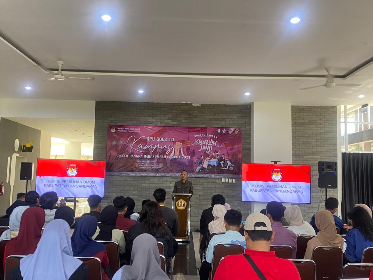 Komisi Pemilihan Umum (KPU) Kabupaten Pangandaran terus bergerak melakukan sosialisasi pendidikan pemilih dan partisipasi masyarakat. Usai melakukan Goes To Pesantren, kali ini KPU Kabupaten Pangandaran melakukan Goes To Campus dalam rangka memperingati Hari Sumpah Pemuda Tahun 2023, dengan acara Nonton Bareng Film “Kejarlah Janji” di Kampus PSDKU UNPAD Pangandaran, dan acara ini dihadiri oleh Ketua KPU Kabupaten Pangandaran, Anggota KPU Kabupaten Pangandaran, Sekretaris beserta Penjabat Struktural dan Staf di Lingkungan KPU Kabupaten Pangandaran, Kepala Kantor PSDKU UNPAD Pangandaran dan Mahasiswa Mahasiswi PSDKU UNPAD Pangandaran. Sabtu (28/10/2023).