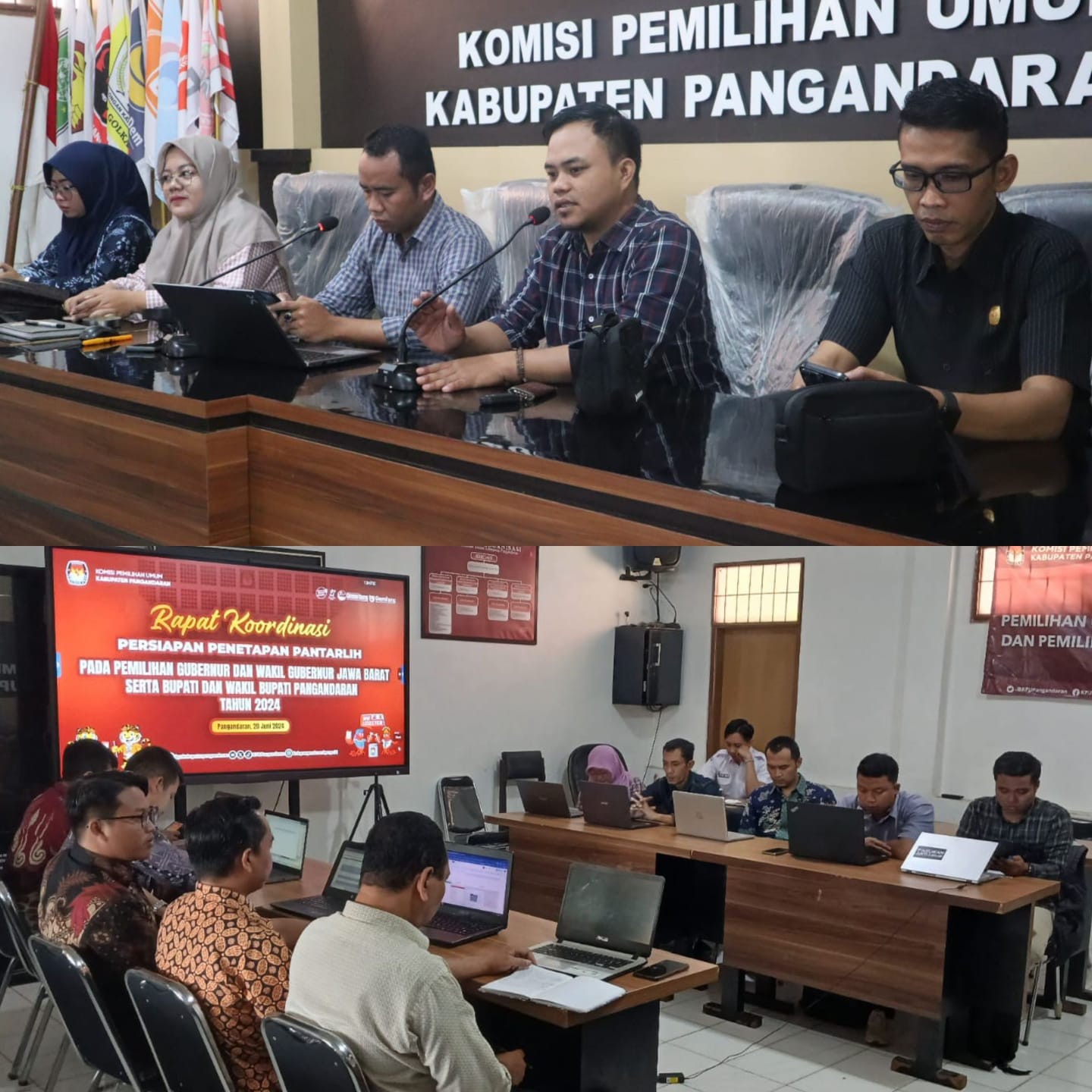 Pangandaran - Komisi Pemilihan Umum (KPU) Kabupaten Pangandaran melaksanakan Rapat Koordinasi terkait Persiapan Penetapan Pantarlilh dalam Pemilihan Gubernur dan Wakil Gubernur Jawa Barat serta Bupati dan Wakil Bupati Pangandaran Tahun 2024 dengan Anggota PPK Divisi Hukum dan Pengawasan se-Kabupaten Pangandaran, di Aula Kantor KPU Kabupaten Pangandaran, Kamis, (20/06/2024).