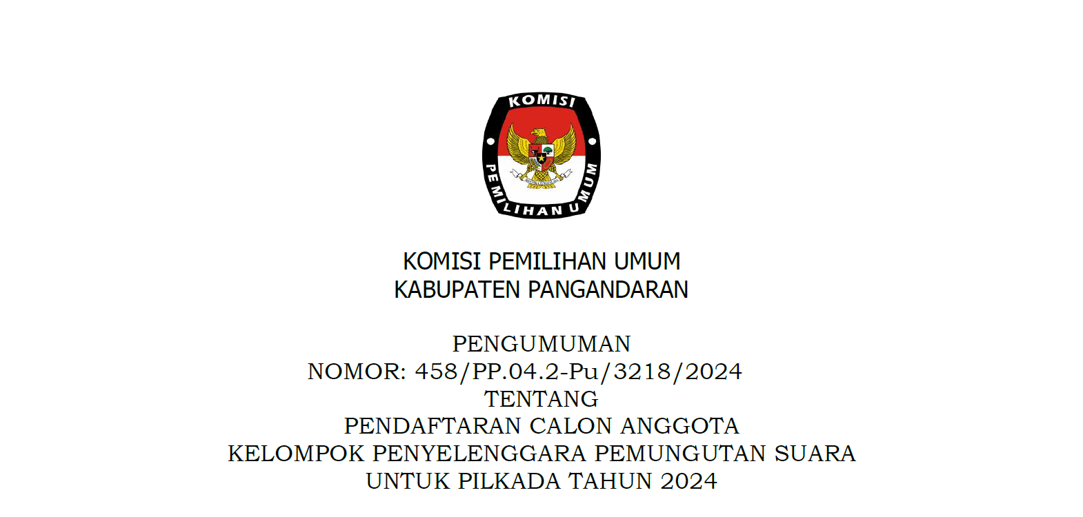 Dalam rangka pembentukan KPPS untuk Pemilihan Gubernur dan Wakil Gubernur, Bupati dan Wakil Bupati, dan Wali Kota dan Wakil Wali Kota Tahun 2024, Komisi Pemilihan Umum Kabupaten Pangandaran mengundang Warga Negara Indonesia yang memenuhi persyaratan untuk mendaftarkan diri menjadi anggota KPPS untuk Pemilihan Gubernur dan Wakil Gubernur, Bupati dan Wakil Bupati, dan Wali Kota dan Wakil Wali Kota Tahun 2024, Komisi Pemilihan Umum Kabupaten Pangandaran dengan ketentuan sebagai berikut: