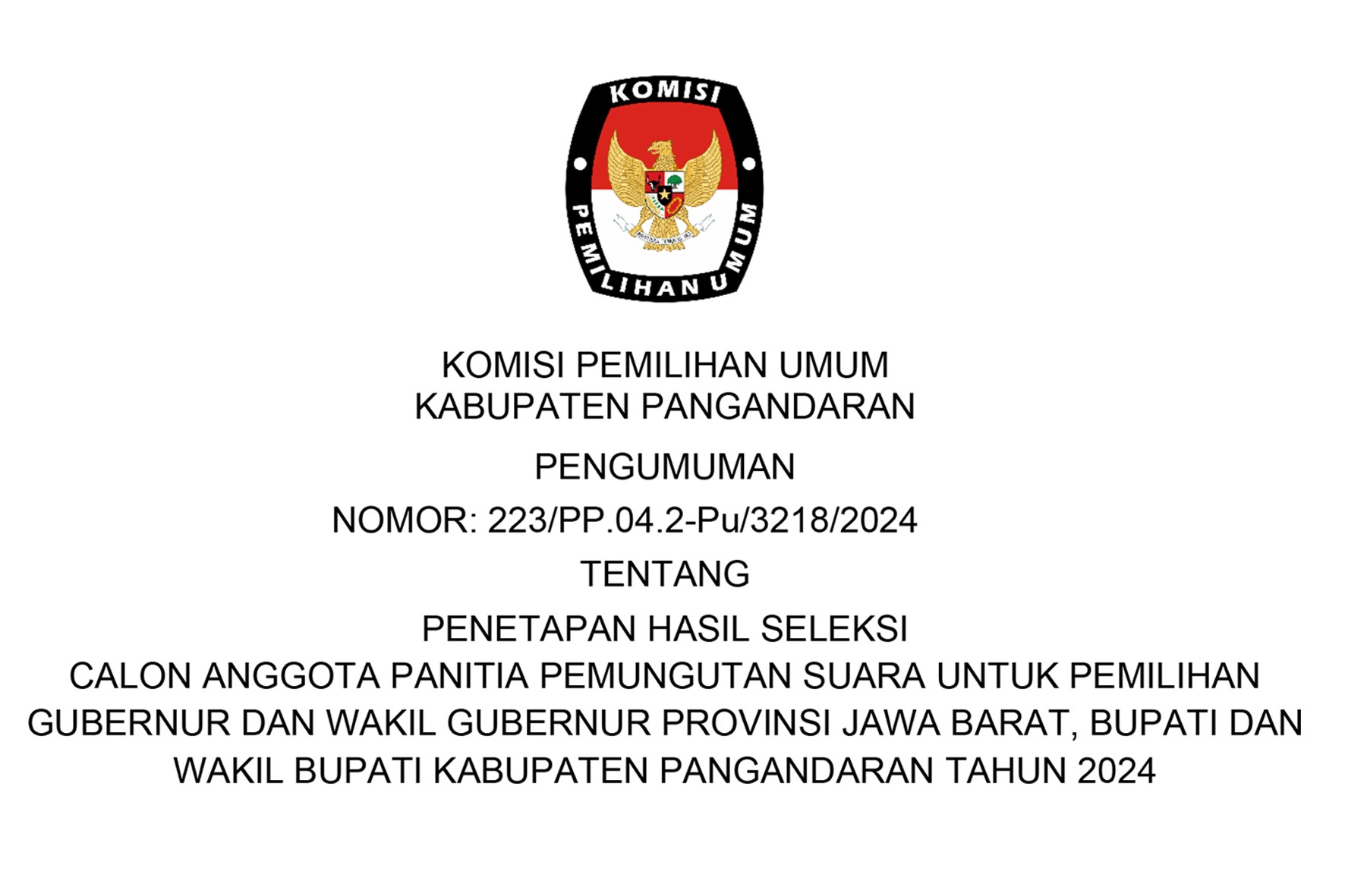 PENETAPAN HASIL SELEKSI CALON ANGGOTA PANITIA PEMUNGUTAN SUARA UNTUK PEMILIHAN GUBERNUR DAN WAKIL GUBERNUR PROVINSI JAWA BARAT, BUPATI DAN WAKIL BUPATI KABUPATEN PANGANDARAN TAHUN 2024