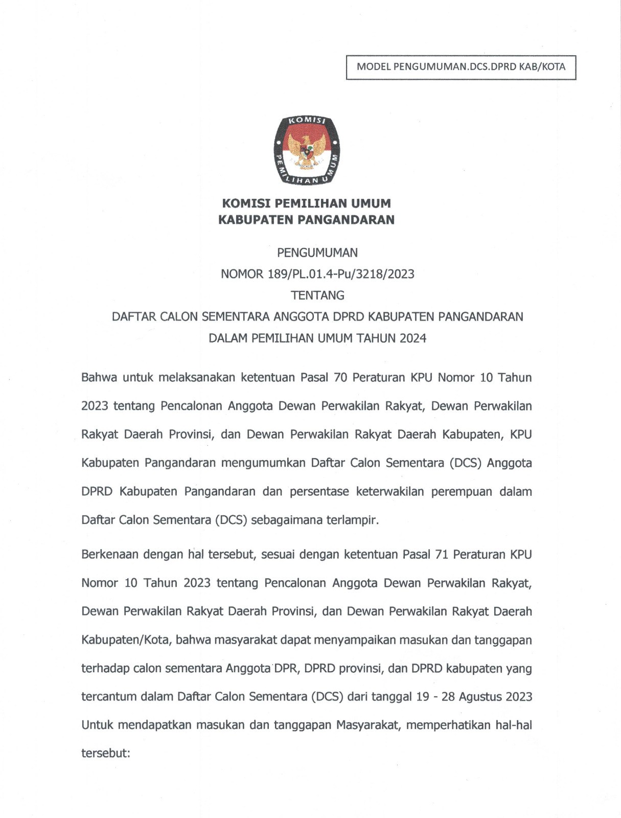 PENGUMUMAN DAFTAR CALON SEMENTARA ANGGOTA DPRD KABUPATEN PANGANDARAN DALAM PEMILIHAN UMUM TAHUN 2024