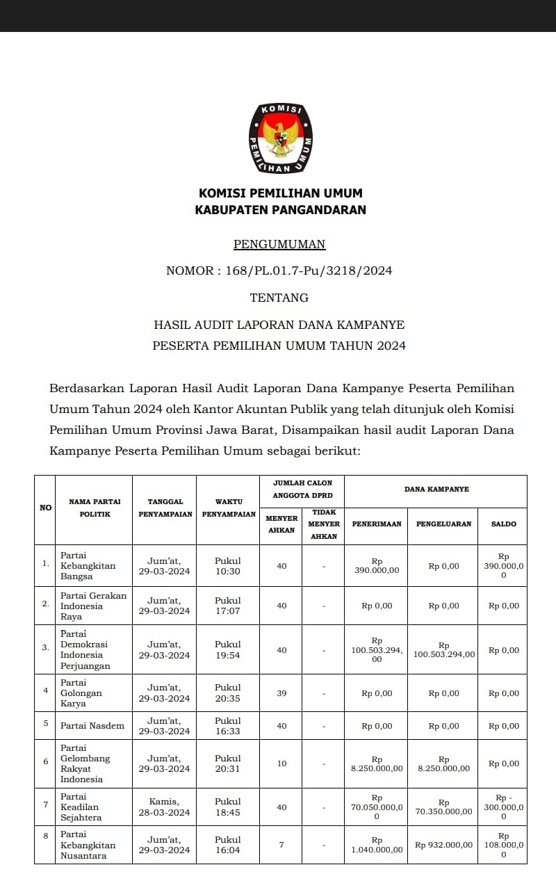 Terlampir disampaikan Pengumuman KPU Kabupaten Pangandaran Nomor 168/PL.01.7-Pu/3218/2024 tentang Hasil Audit Laporan Dana Kampanye Peserta Pemilihan Umum Tahun 2024.