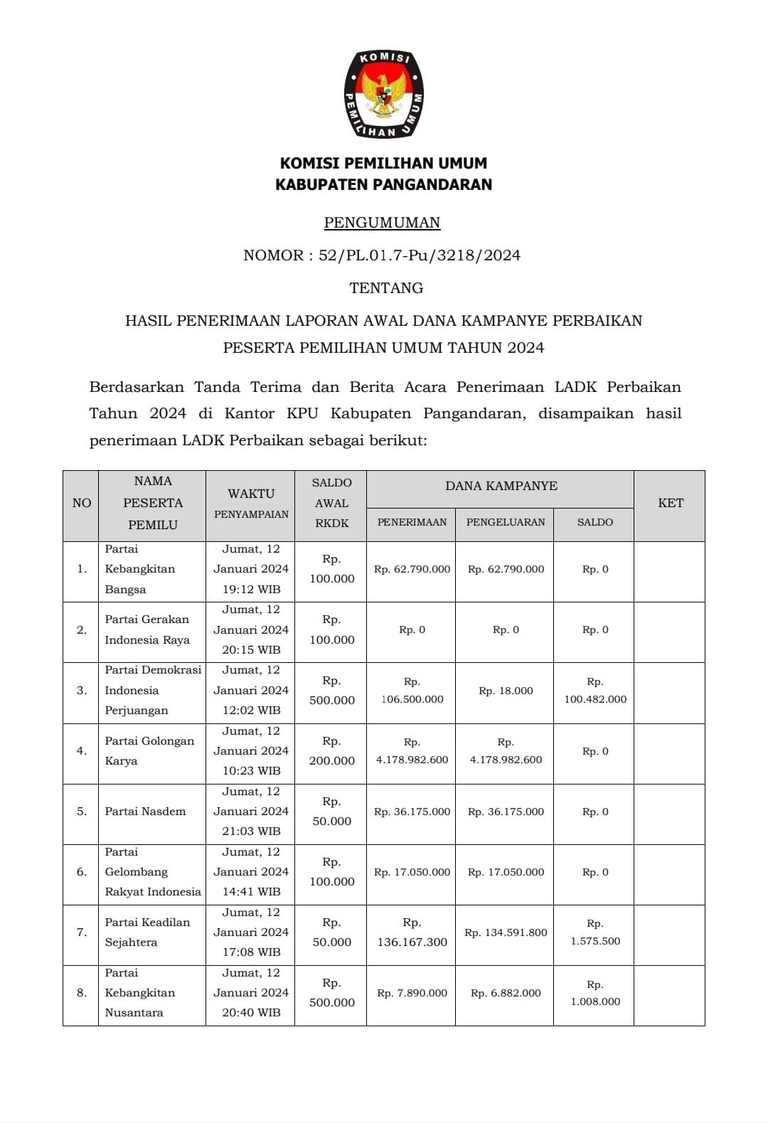 Terlampir disampaikan Pengumuman KPU Kabupaten Pangandaran Nomor 52/PL.01.7-Pu/3218/2024 tentang Hasil Penerimaan Awal Dana Kampanye Perbaikan Peserta Pemilihan Umum Tahun 2024.