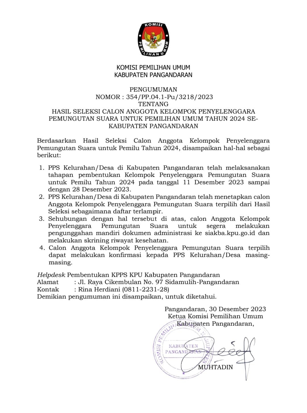 Terlampir disampaikan Pengumuman KPU Kabupaten Pangandaran Nomor 354/PP.04.1-Pu/3218/2023 tentang Hasil Seleksi Calon Anggota Kelompok Penyelenggara Pemungutan Suara (KPPS) Untuk Pemilihan Umum Tahun 2024 Se-Kabupaten Pangandaran.