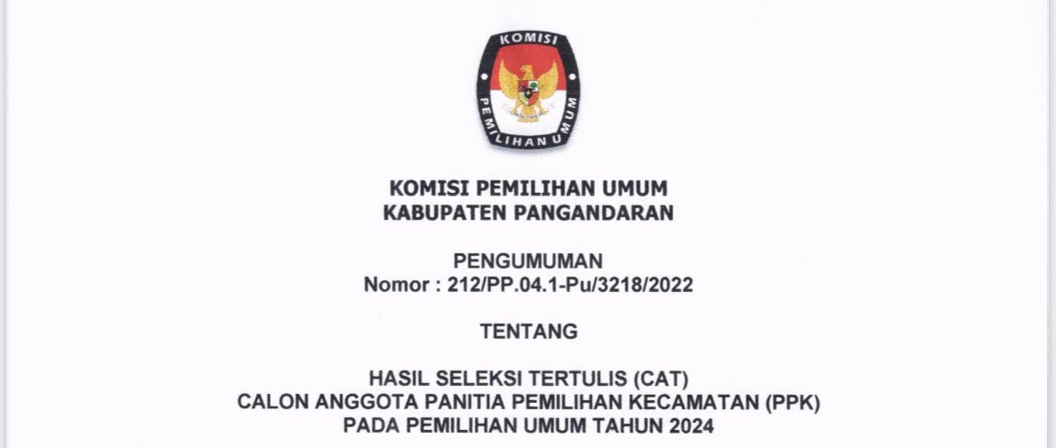 Terlampir disampaikan Pengumuman Hasil Seleksi Tertulis (CAT) Calon Anggota Panitia Pemilihan Kecamatan (PPK) pada Pemilu Tahun 2024,