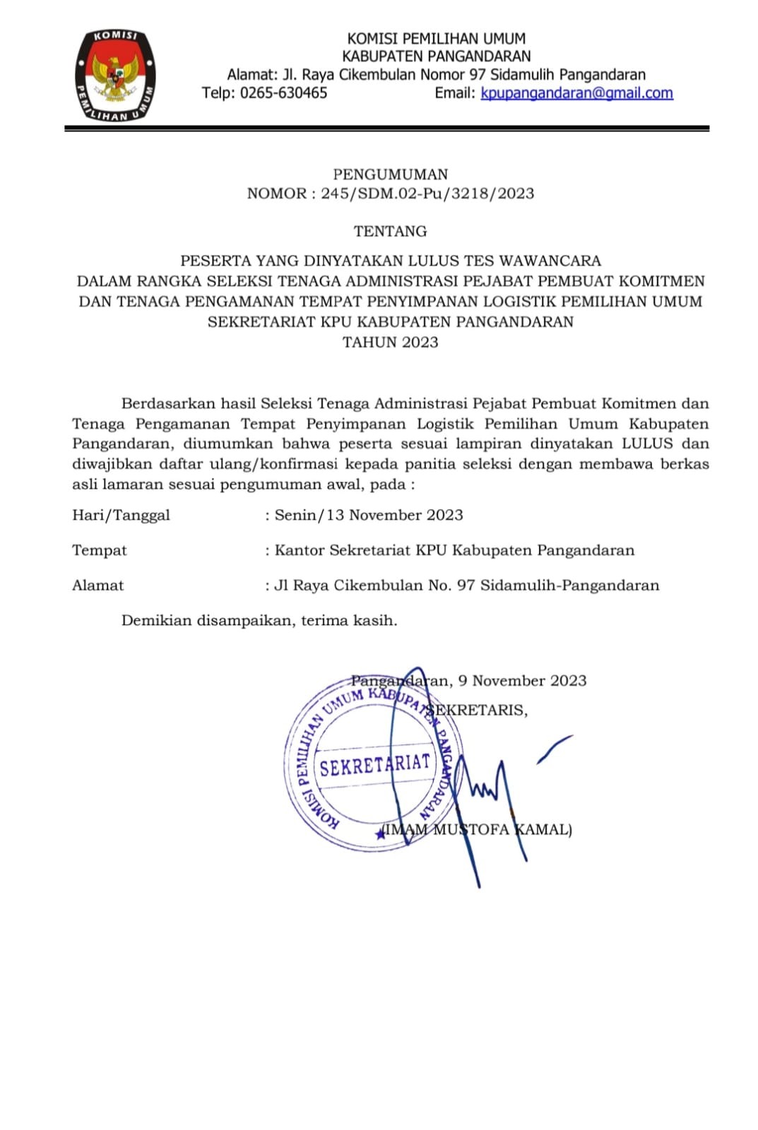 Berikut disampaikan Pengumuman Nomor 245/SDM.02-Pu/3218/2023 tentang Peserta yang Dinyatakan Lulus Tes Wawancara dalam rangka Seleksi Tenaga Administrasi Penjabat Pembuat Komitmen dan Tenaga Pengamanan Tempat Penyimpanan Logistik Pemilihan Umum Sekretariat KPU Kabupaten Pangandaran Tahun 2023.