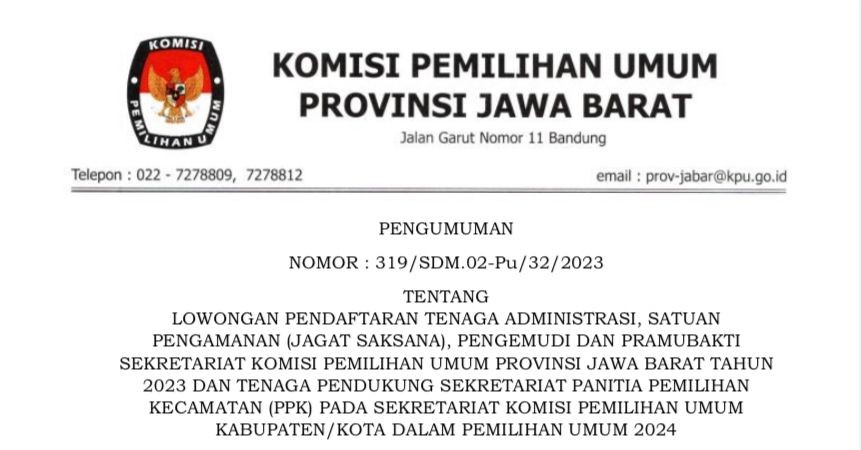 terlampir disampaikan Pengumuman KPU Provinsi Jawa Barat Nomor 319SD.02-Pu/32/2023 tentang Pengumuman Lowongan Pendaftaran Tenaga Administrasi, Satuan Pengamanan (Jagat Saksana), Pengemudi dan Pramubakti Sekretariat KPU Provinsi Jawa Barat Tahun 2023 dan Tenaga Pendukung Sekretariat PPK pada Sekretariat KPU Kabupaten/Kota dalam Pemilu Tahun 2024.