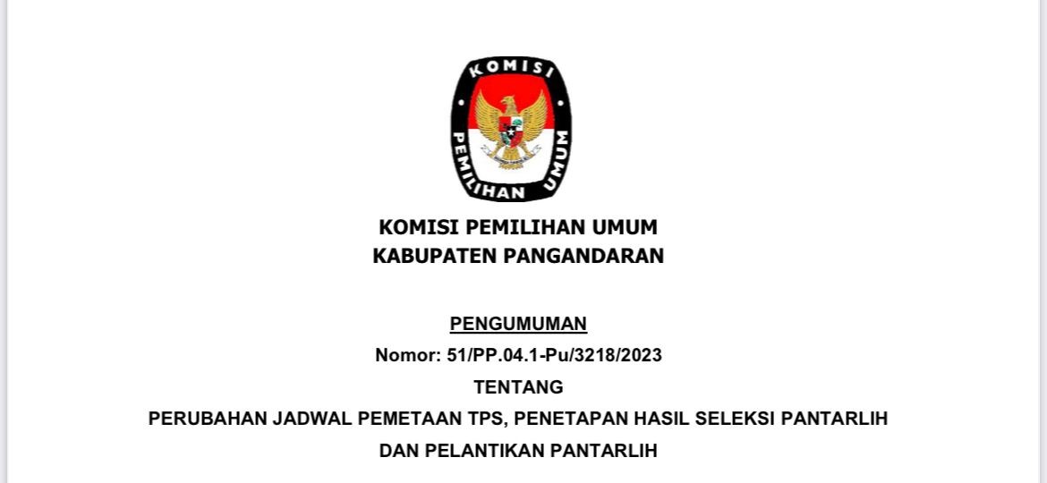 berikut kami sampaikan Pengumuman KPU Kabupaten Pangandaran Nomor 51/PP.04.1-Pu/3218/2023 tentang Perubahan Jadwal Pemetaan TPS, Penetapan Hasil Seleksi Pantarlih dan Pelantikan Pantarlih.