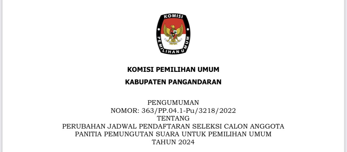 berikut kami sampaikan pengumuman tentang perubahan jadwal seleksi calon anggota Panitia Pemungutan Suara untuk Pemilu Tahun 2024 berdasarkan Keputusan KPU Nomor 534 Tahun 2022 tentang Perubahan Kedua atas Keputusan KPU Nomor 476 Tahun 2022.