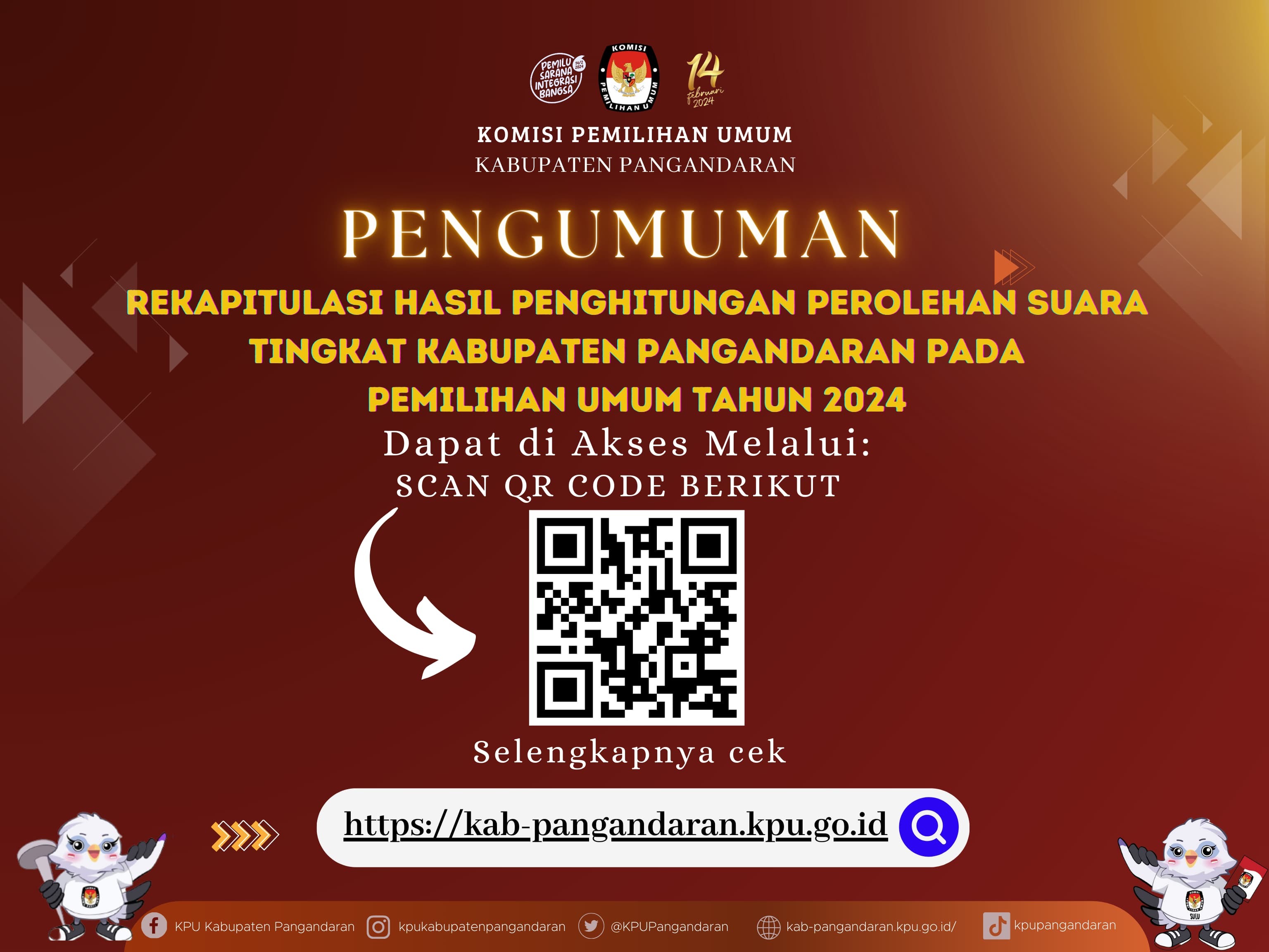 Terlampir disampaikan Pengumuman KPU Kabupaten Pangandaran tentang Pelaksanaan Rekapitulasi Hasil Penghitungan Perolehan Suara Tingkat Kabupaten Pangandaran pada Pemilihan Umum Tahun 2024, pada Hari Jum'at Tanggal 1 Maret Tahun 2024 Bertempat di Ball Room Hotel Pantai Indah Resort Pangandaran.
