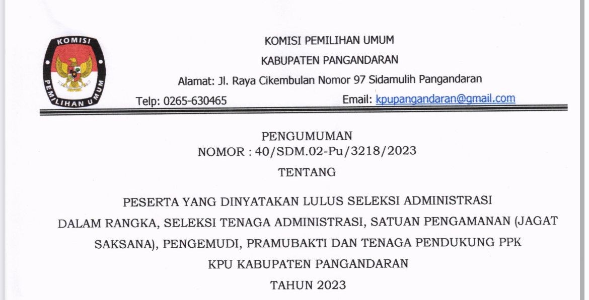 terlampir disampaikan Pengumuman Nomor 40/SDM.01-Pu/3218/2023 tentang Peserta yang Dinyatakan Lulus Seleksi Administrasi dalam rangka Seleksi Tenaga Administrasi, Satuan Pengamanan (Jagat Saksana), Pengemudi, Pramubakti dan Tenaga Pendukung PPK KPU Kabupaten Pangandaran Tahun 2023.