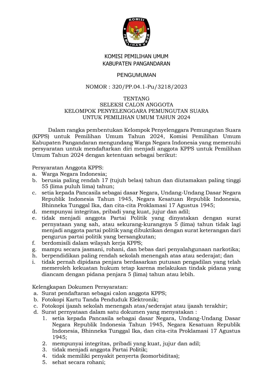 Terlampir disampaikan Pengumuman KPU Kabupaten Pangandaran Nomor 320/PP.04.1-Pu/3218/2023 tentang Seleksi Calon Anggota Kelompok Penyelenggara Pemungutan Suara (KPPS) Untuk Pemilihan Umum Tahun 2024.