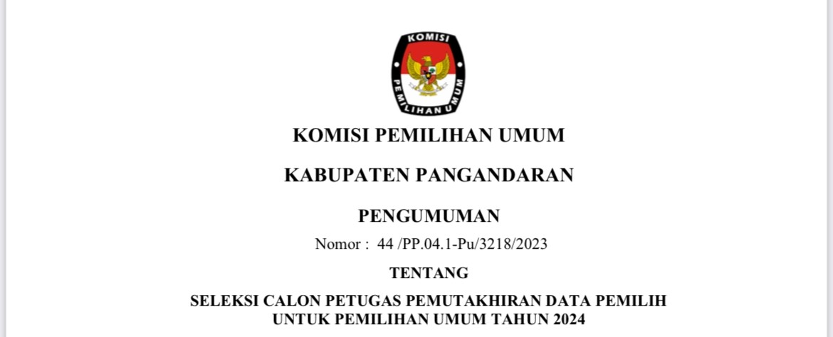berikut disampaikan Pengumuman Nomor 44/PP.04.1-Pu/3218/2023 tentang Seleksi Calon Petugas Pemutakhiran Data Pemilih untuk Pemilihan Umum Tahun 2024.