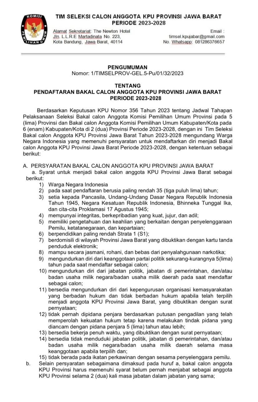 Pengumuman Seleksi Pendaftaran Bakal Calon Anggota KPU Provinsi Jawa Barat Periode 2023 - 2028