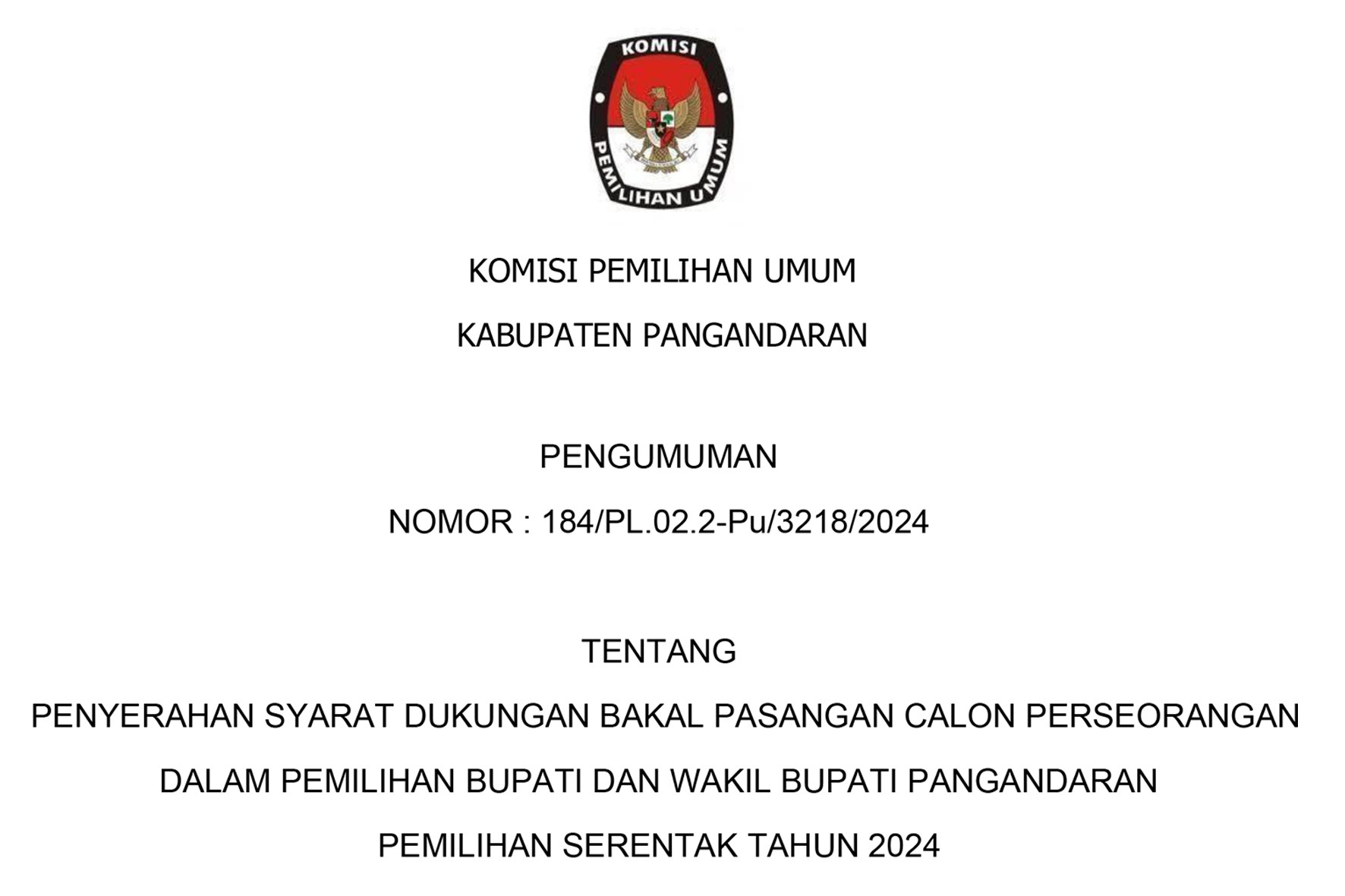 Berdasarkan Peraturan Komisi Pemilihan Umum Nomor 2 Tahun 2024 tentang Tahapan dan Jadwal Pemilihan Gubernur dan Wakil Gubernur, Bupati dan Wakil Bupati, serta Walikota dan Wakil Walikota Tahun 2024 dan Keputusan Komisi Pemilihan Umum Kabupaten Pangandaran Nomor : 317 Tahun 2024 tentang Penetapan Syarat Minimal dan Penyerahan Dukungan Bakal Pasangan Calon Perseorangan dalam Pemiliihan Bupati dan Wakil Bupati Kabupaten Pangandaran Tahun 2024, Bersama ini diumumkan Penyerahan Syarat Dukungan Bakal Pasangan Calon Bupati dan Wakil Bupati Pangandaran melalui jalur perseorangan dapat melengkapi dan menyerahkan persyaratan dukungan dengan ketentuan sebagai berikut :
