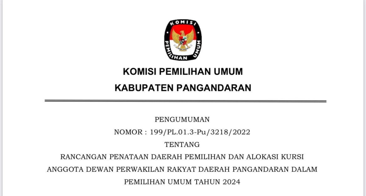 Berdasarkan pada Berita Acara Komisi Pemilihan Umum Kabupaten Pangandaran Nomor 199/PL.01.3-Pu/3218/2022 tentang Penetapan Rancangan Penataan Daerah Pemilihan dan Alokasi Kursi Anggota Dewan Perwakilan Rakyat Daerah Kabupaten/Kota dalam Pemilihan Umum Tahun 2024, dengan ini KPU Kabupaten Pangandaran mengumumkan Rancangan Penataan Daerah Pemilihan dan Alokasi Kursi Anggota Dewan Perwakilan Rakyat Daerah Kabupaten Pangandaran dalam Pemilihan Umum Tahun 2024 untuk mendapatkan masukan dan tanggapan masyarakat sebagaimana tercantum dalam lampiran pengumuman ini.