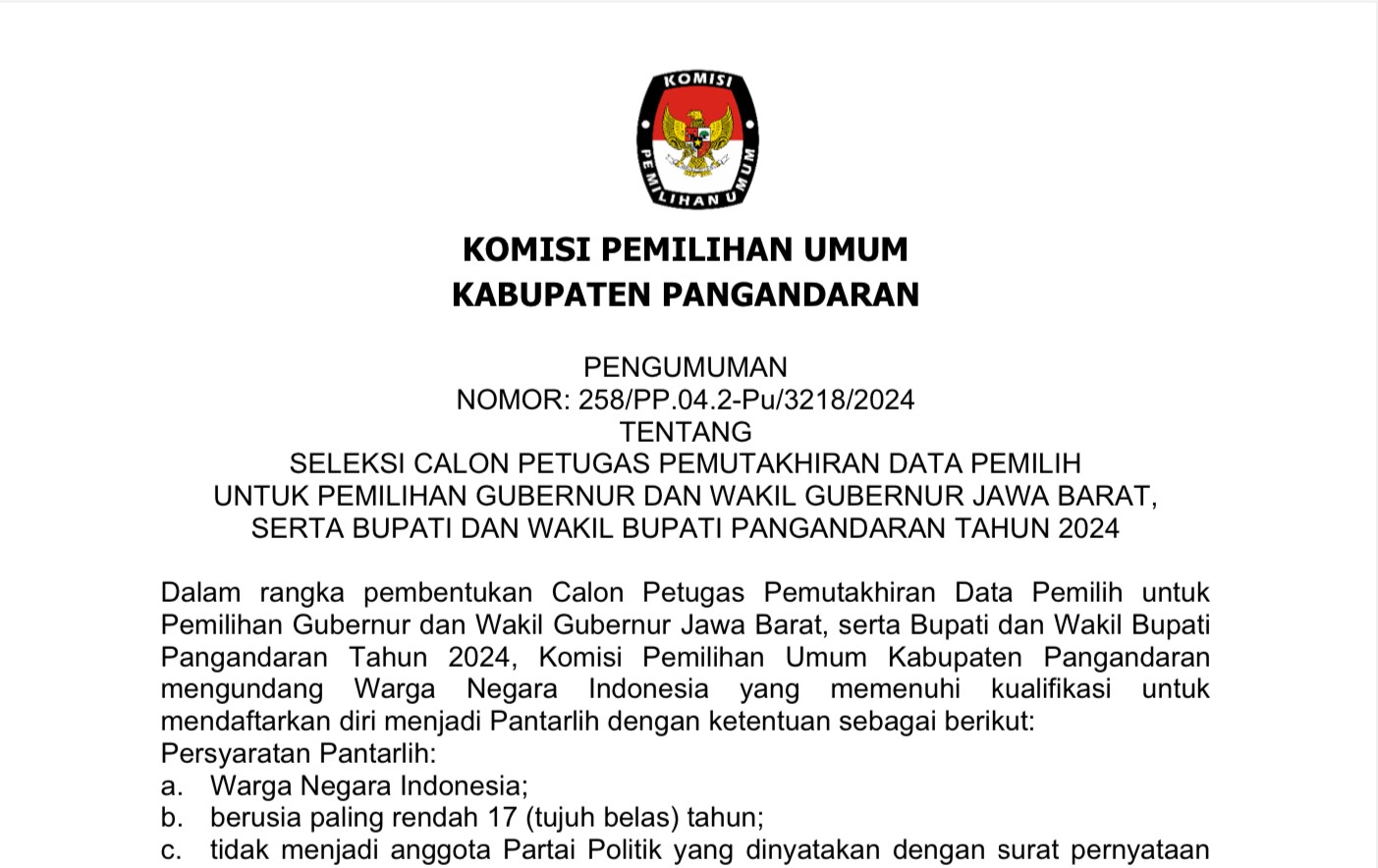PENGUMUMAN NOMOR: 258/PP.04.2-Pu/3218/2024 TENTANG SELEKSI CALON PETUGAS PEMUTAKHIRAN DATA PEMILIH UNTUK PEMILIHAN GUBERNUR DAN WAKIL GUBERNUR JAWA BARAT, SERTA BUPATI DAN WAKIL BUPATI PANGANDARAN TAHUN 2024