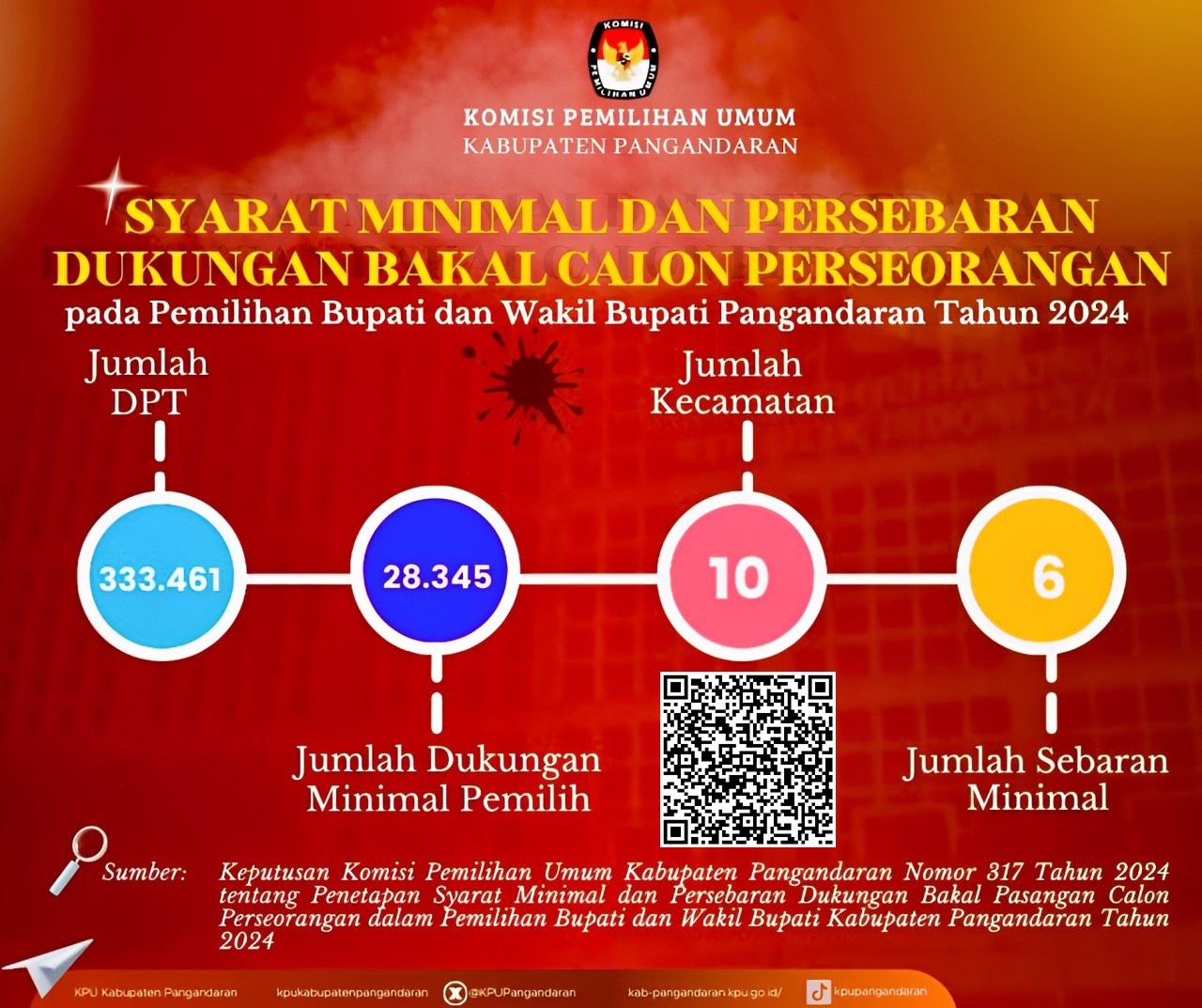 - Berdasarkan Keputusan KPU Kabupaten Pangandaran Nomor 317 Tahun 2024 Tentang Penetapan Syarat Minimal dan Persebaran Dukungan Bakal Pasangan Calon Perseorangan Dalam Pemilihan Bupati dan Wakil Bupati Kabupaten Pangandaran Tahun 2024, dinyatakan bahwa syarat Minimal dan Persebaran Dukungan Bakal Pasangan Calon Perseorangan dalam Pemilihan Bupati dan Wakil Bupati Pangandaran Tahun 2024, didukung paling sedikit 8,5% oleh penduduk yang terdaftar dalam Daftar Pemilih Tetap (DPT) Pemilihan Umum Tahun 2024 yaitu sebanyak 28.345 (Dua Puluh Delapan Ribu Tiga Ratus Empat Puluh Lima) dukungan; dan tersebar dilebih dari 50% (lima puluh persen) Kecamatan di Kabupaten Pangandaran, yaitu paling sedikit di 6 (enam) Kecamatan.
